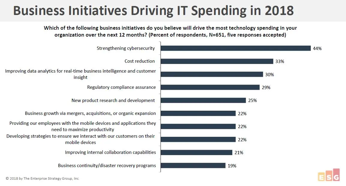 Milford, Mass.-based IT research firm Enterprise Strategy Group (ESG) surveyed 651 IT decision makers at midmarket and enterprise companies representing more than 20 industries and found that 53% are spending more on IT in 2018. And 44% cited "strengthening cybersecurity" as the number one reason.
